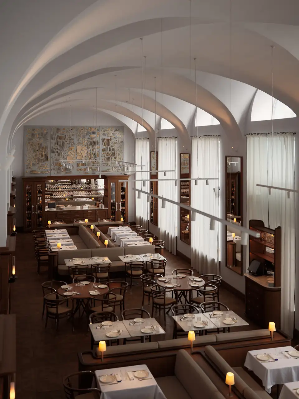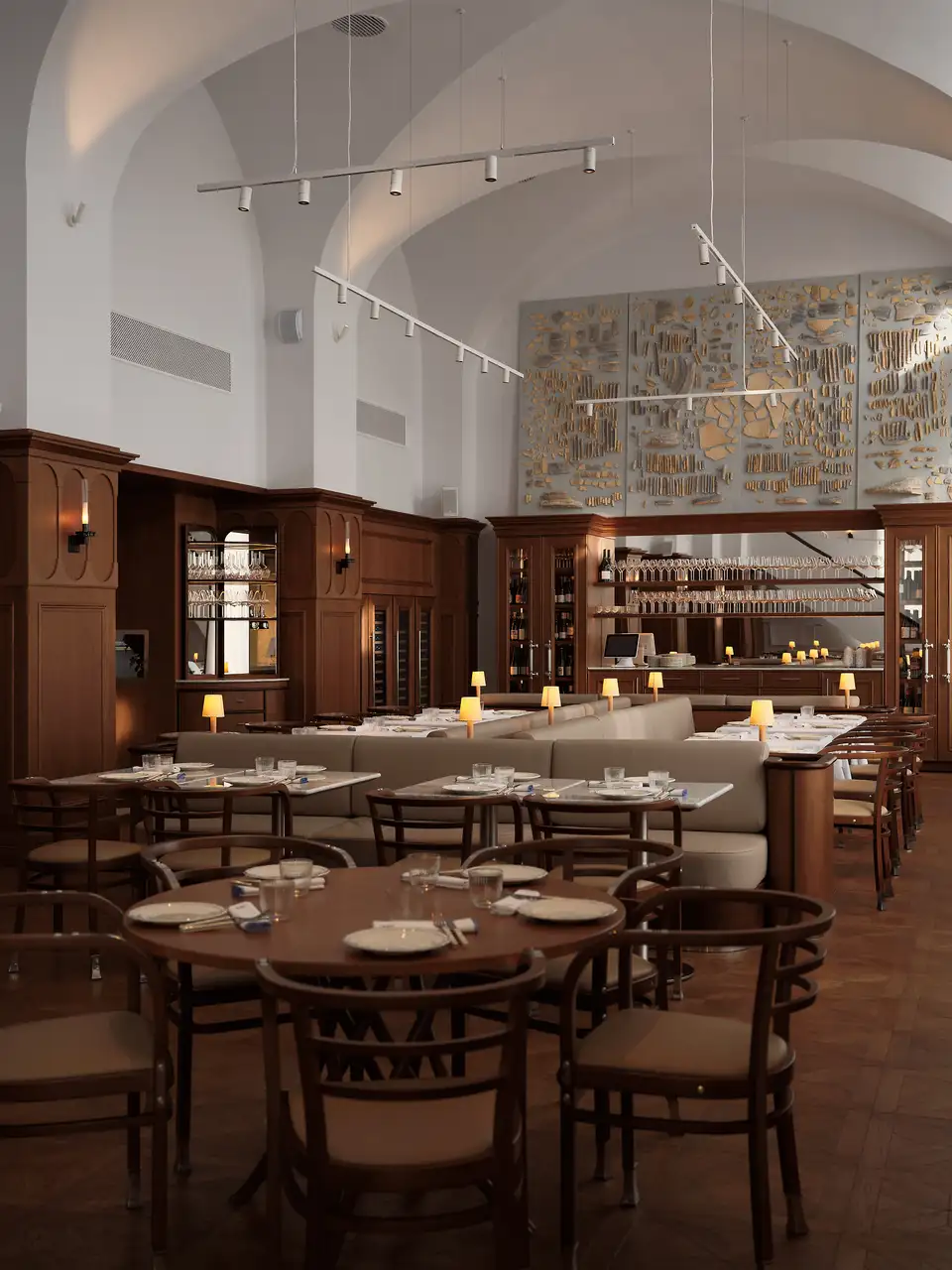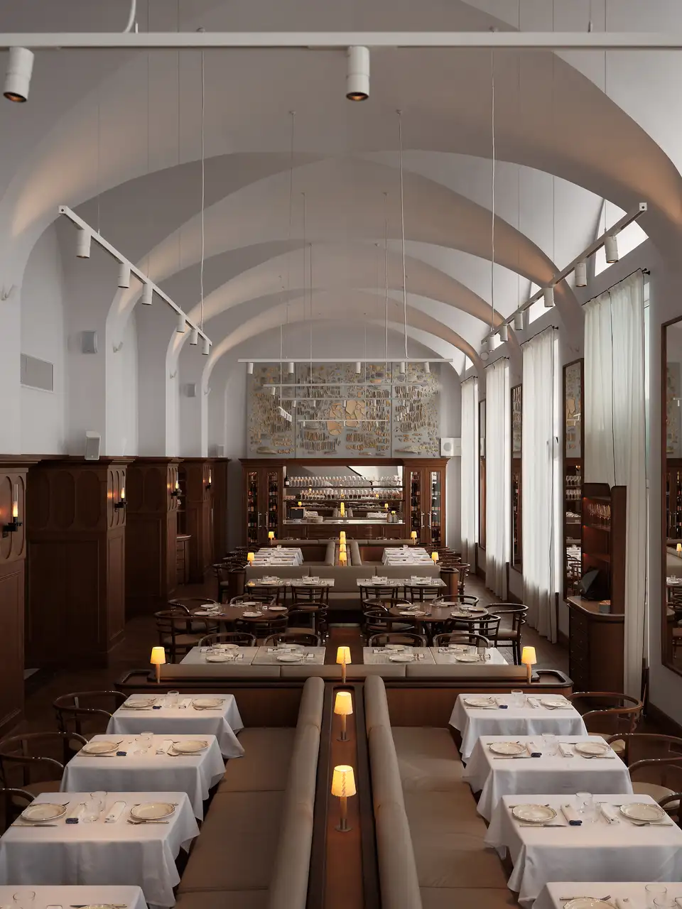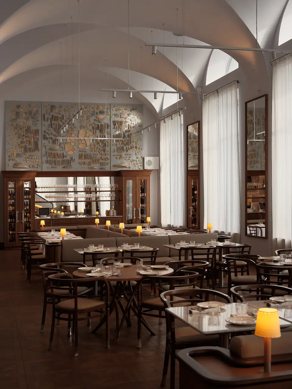Над оформлением работала студия APAA Алексея Пенюка и Анастасии Артемьевой, постоянное архитектурное бюро заведений Дмитрия Блинова. В интерьере высокие потолки арками, много света, минимум декоративного шума и, как всегда, открытая кухня и современное искусство.
