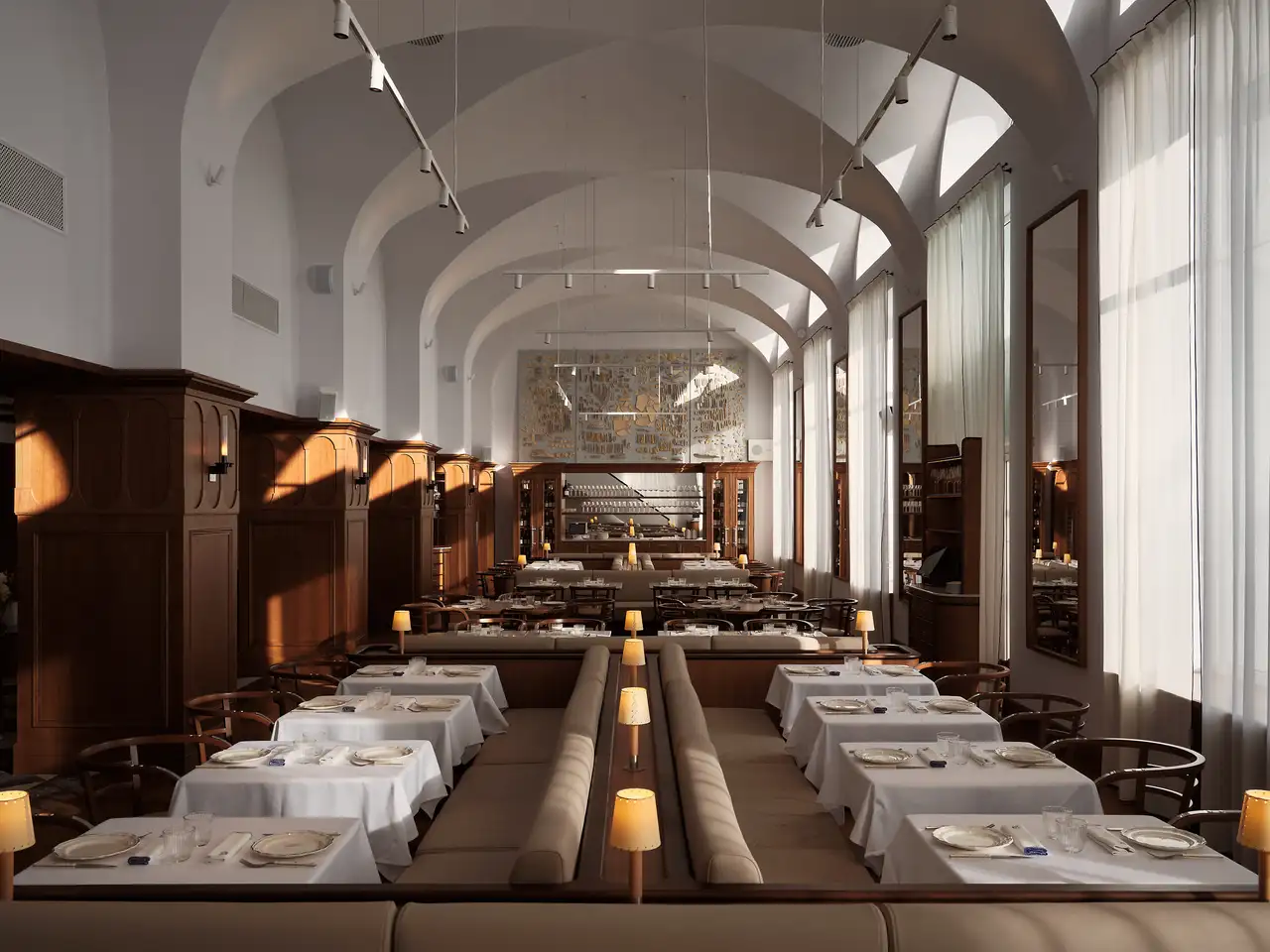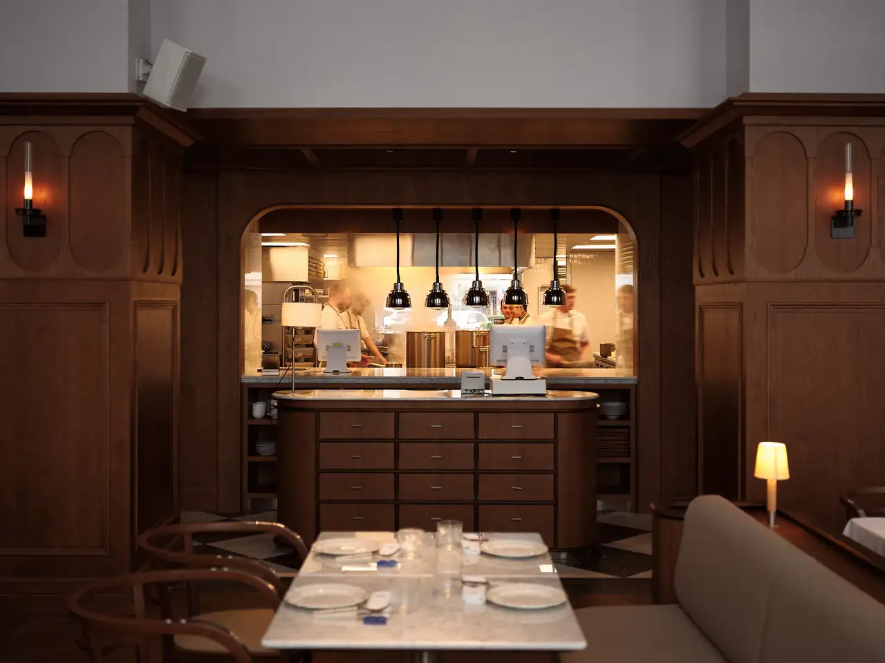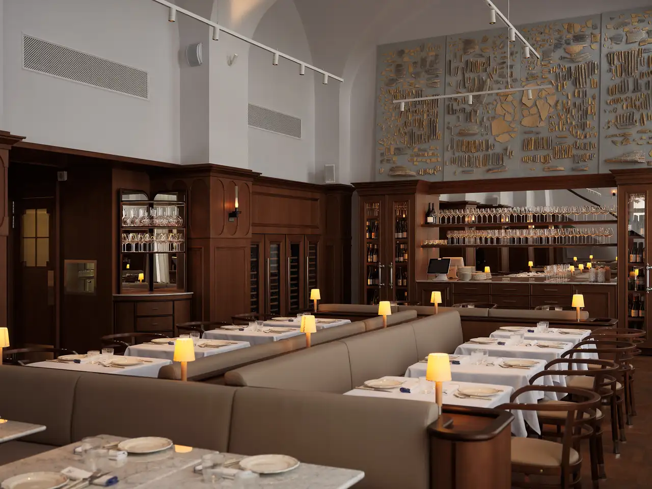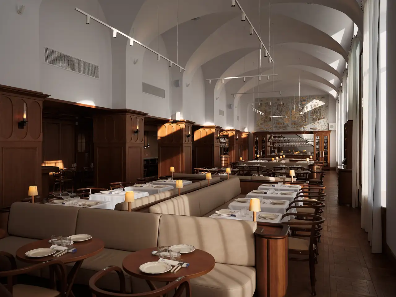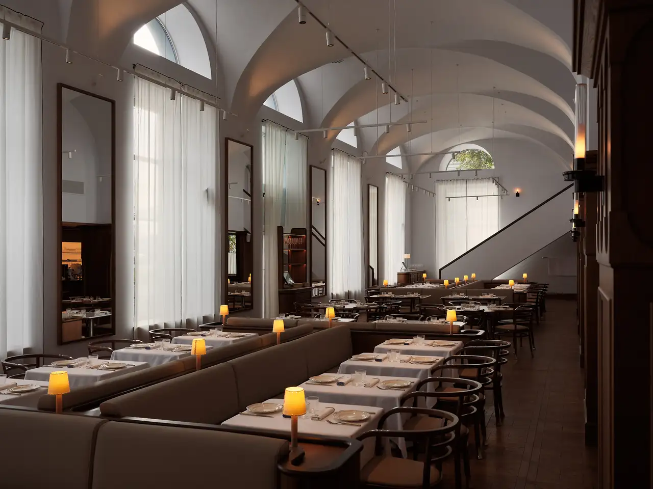 Над оформлением работала студия APAA Алексея Пенюка и Анастасии Артемьевой, постоянное архитектурное бюро заведений Дмитрия Блинова. В интерьере высокие потолки арками, много света, минимум декоративного шума и, как всегда, открытая кухня и современное искусство.
